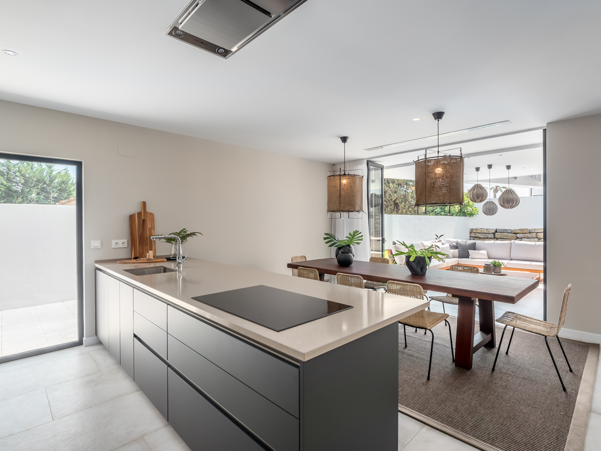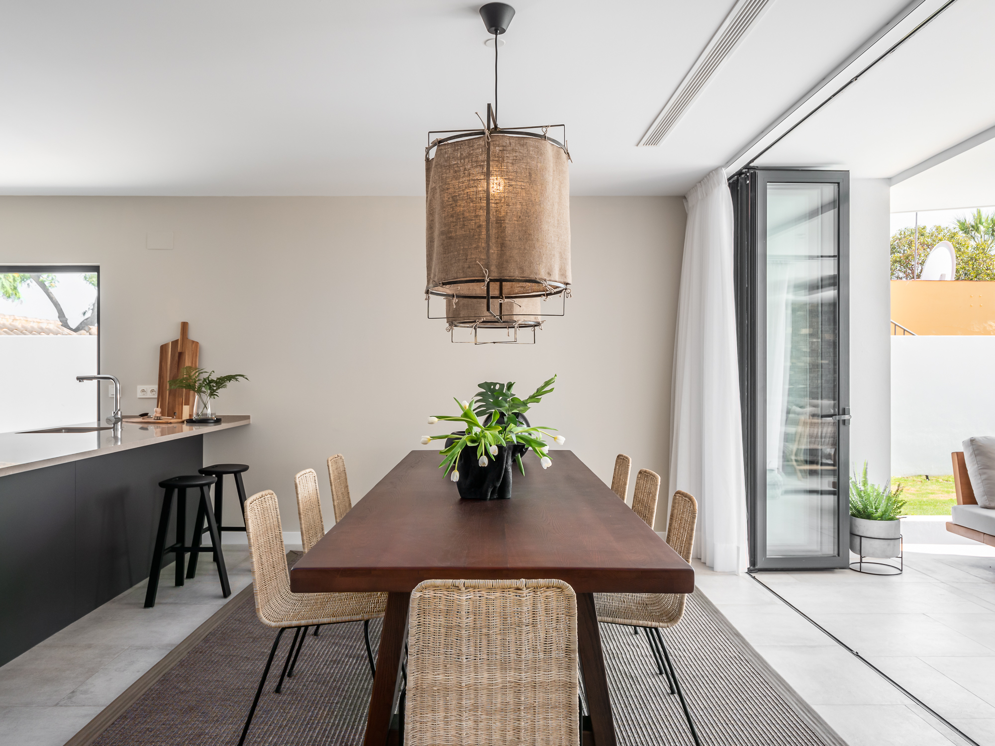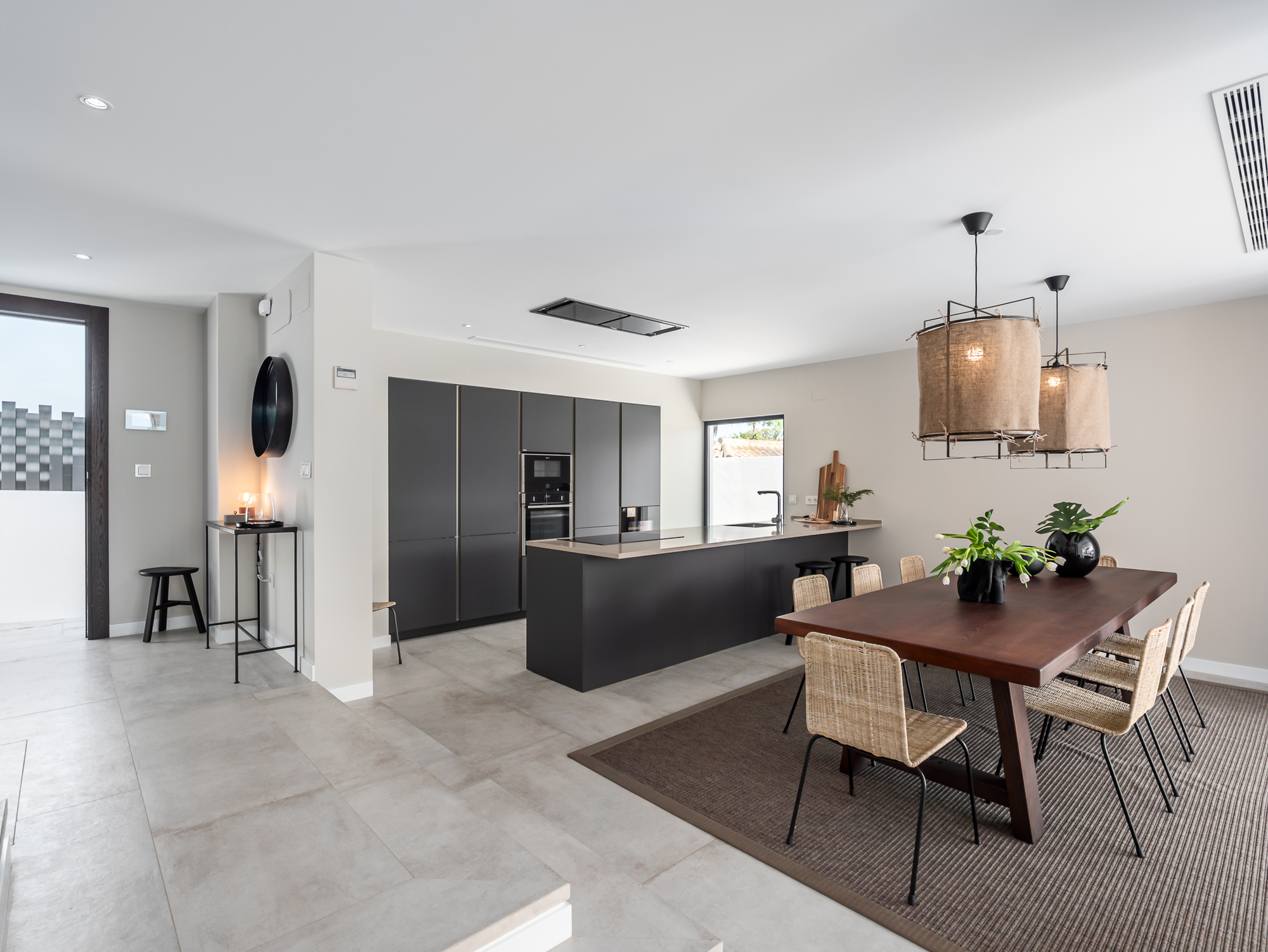 Bottenvåningen utformades med fokus på ett sömlöst flöde mellan inne och ute – anpassat för det spanska klimatet och ett liv där sociala ytor och utomhusmiljöer är en naturlig del av vardagen.