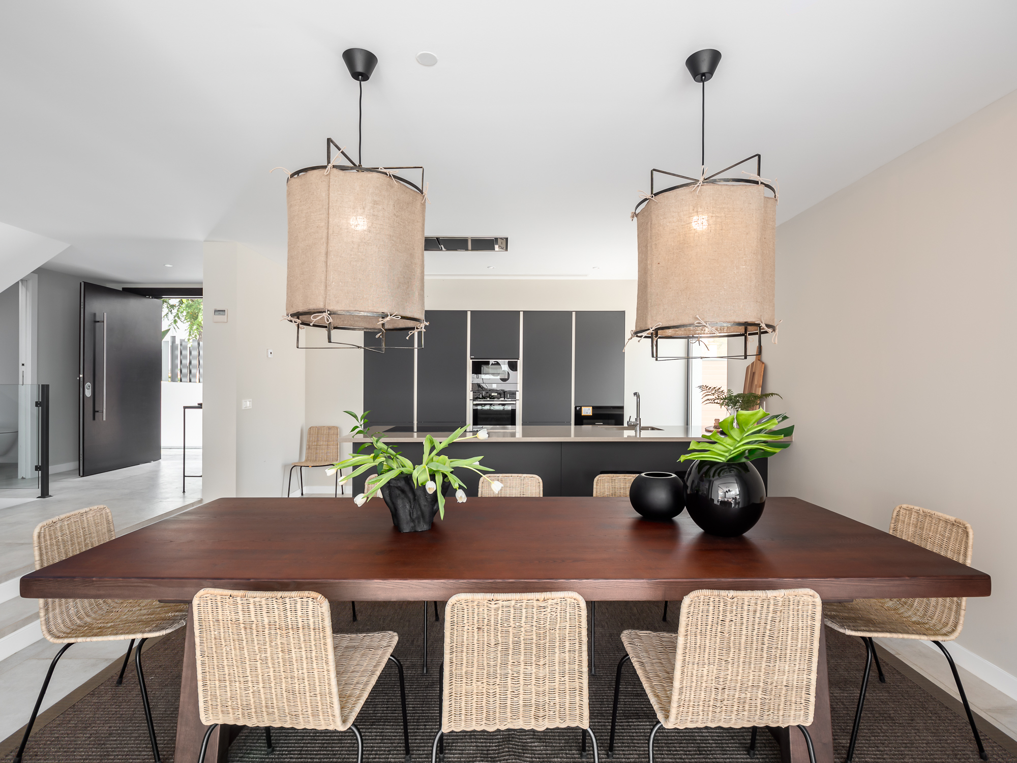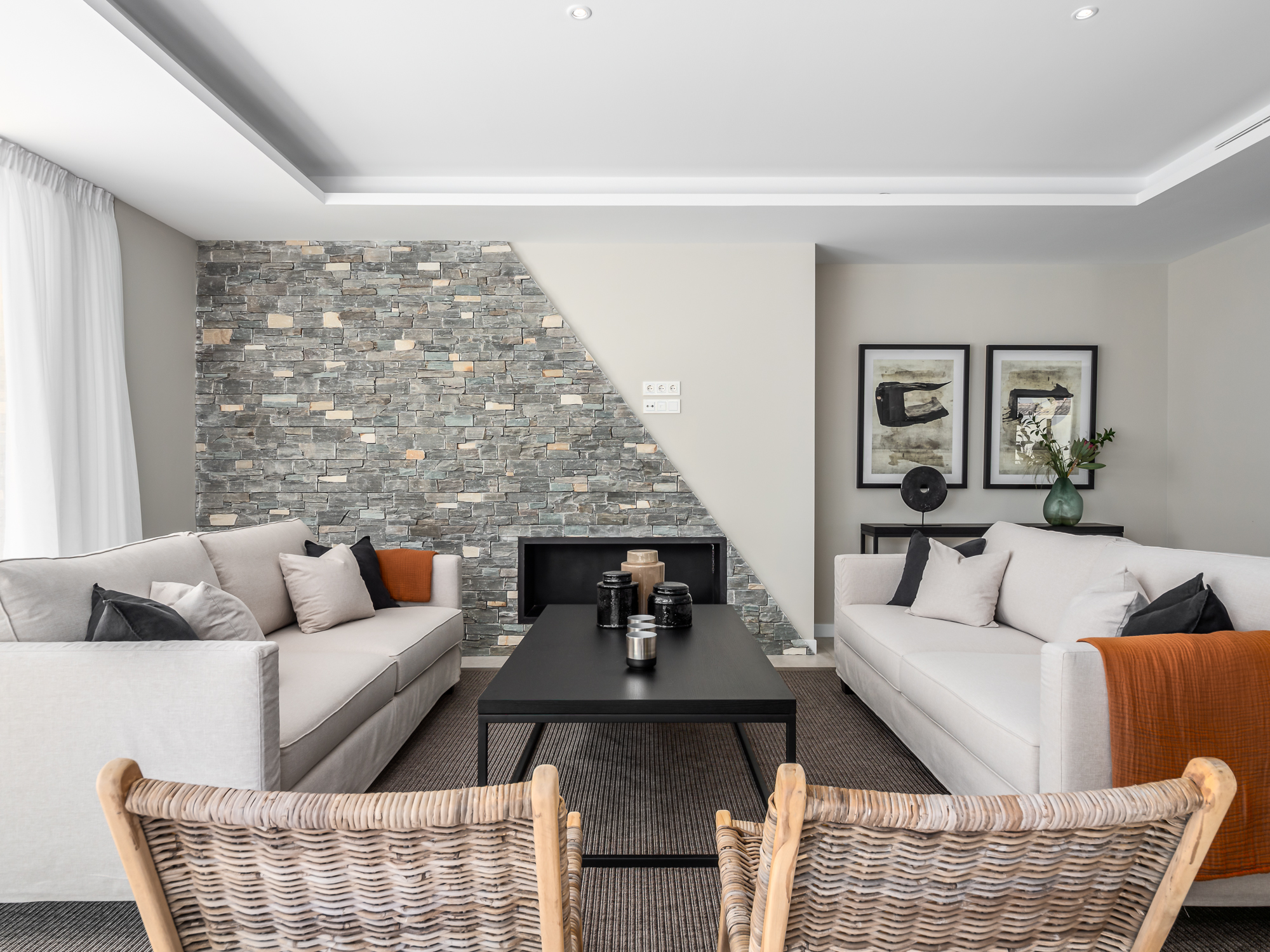 Inredningen bygger på noggrant utvalda material, lager på lager av texturer och skräddarsydda lösningar som ger varje rum sin egen identitet, samtidigt som helheten upplevs lugn och sammanhållen. Genom varierade färgpaletter och möblering anpassad efter bostadens arkitektur skapades ett harmoniskt och funktionellt hem för ett modernt villaliv.